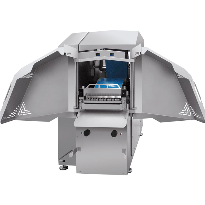 Der DICECUT® 506 bietet mit einer Schneidraumbreite von 630mm auch die Möglichkeit die Standardblöcke quer zu verarbeiten, womit 50 % mehr Leistung als bei dem DICECUT® 502 erzielt werden. Bei Nutzung der Hebeschüssel, bietet diese Maschine mit einer Schneidraumlänge von 1100 mm darüber hinaus auch die Möglichkeit der Verarbeitung von Plattenfroster-Blöcken, ohne dass diese vorzerkleinert oder komprimiert werden müssten. Die Maschinen können, inkl. Aufgabe der Fleischblöcke und Entnahme des geschnittenen Produktes, von nur einem Mitarbeiter bedient werden. Sie können aber auch in eine komplette Verarbeitungslinie, inkl. Verwiegung und Verpackung, eingebunden werden.