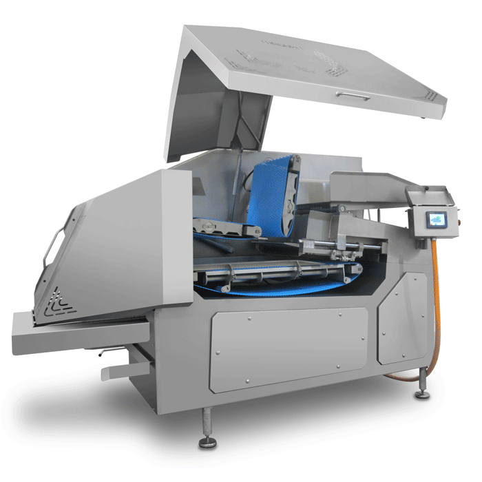 - Integration in automatische Verarbeitungslinie inkl. Blockbeschickung und Abstransport der geschnittenen Ware möglich