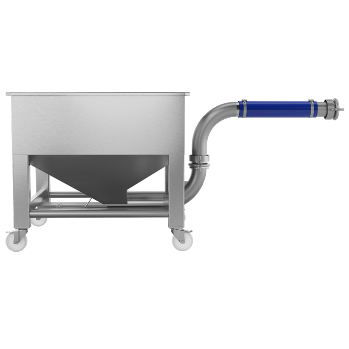 - Auf Wunsch mit Wiegezellen zur Kontrolle der Befüllung des Vakuumtrichters und der nachgeschalteten Maschine