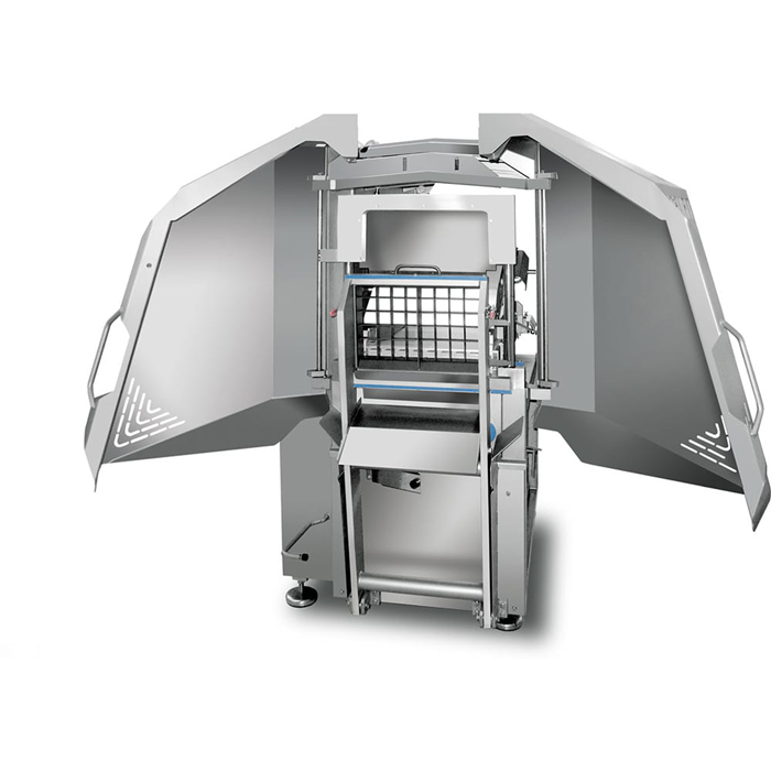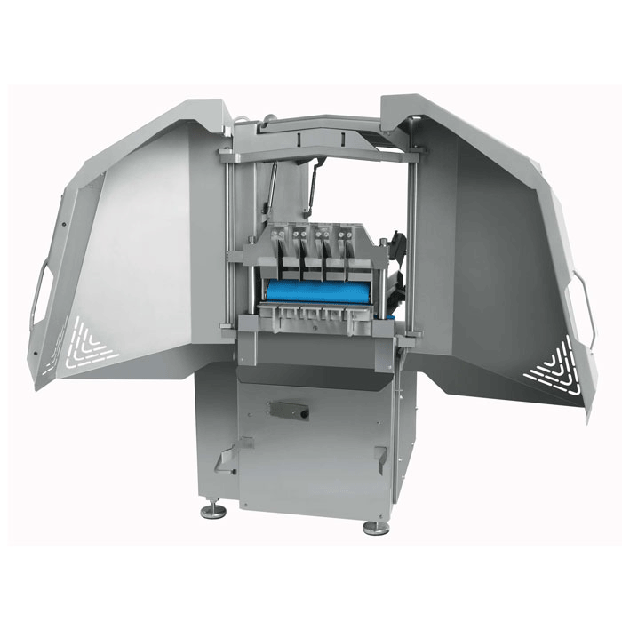 Der UNICUT 584 3D wurde speziell für die Verarbeitung von Käseblöcken oder -laiben zur Herstellung von Reibekäse entwickelt. Dabei schneidet der UNICUT 584 3D aus ganzen Käseblöcken kantengenaue Würfel. Es stehen verschiedene Schneidgatter mit Messerabständen zwischen 30 x 30 mm und 50 x 50 mm zur Verfügung, so dass sich die für das jeweilige Produkt richtige Würfelgrösse schneiden lässt. Die Gatter lassen sich innerhalb weniger Sekunden austauschen. Durch diese schonende, sehr leistungsstarke Vorzerkleinerung der Käseblöcke sind die im anschliessenden Reibeprozess entstehenden Käsestreifen ideal für die automatische Bestreuung von Pizzen, Baguettes oder anderer zu überbackender Gerichte, können aber auch sehr gut für Einzelhandelspackungen abgefüllt werden.