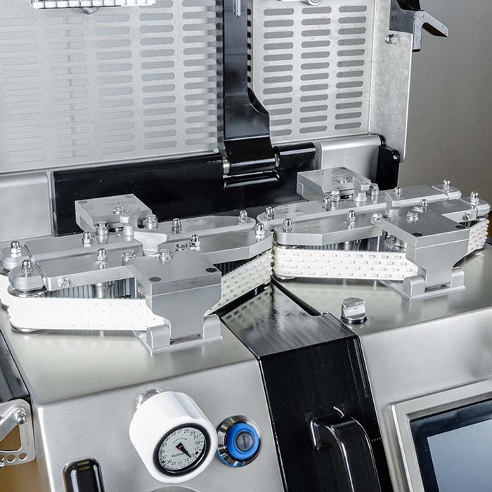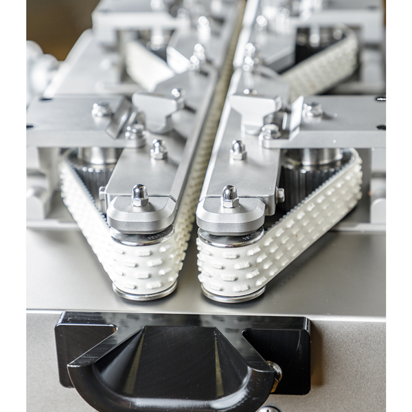 Zur verbesserten Erkennung der Abdrehstellen von Produkten mit eng anliegenden Wurstköpfen, wie beispielsweise geräucherte Wüste im Schweinedarm, wird der Wurststrang vor dem Schnittvorgang gezielt gestreckt. Das zweite Bandpaar lässt sich unabhängig in der Geschwindigkeit regulieren, um die gezielte Streckung im Bereich der Abdrehstellen zu erzeugen. Diese Funktion trägt wesentlich zur Optimierung des Schnittergebnisses bei - insbesondere im Stand-Alone-Betrieb. Die Abstände der Bänder sind zur Anpassung an das Kaliber stufenlos einstellbar.