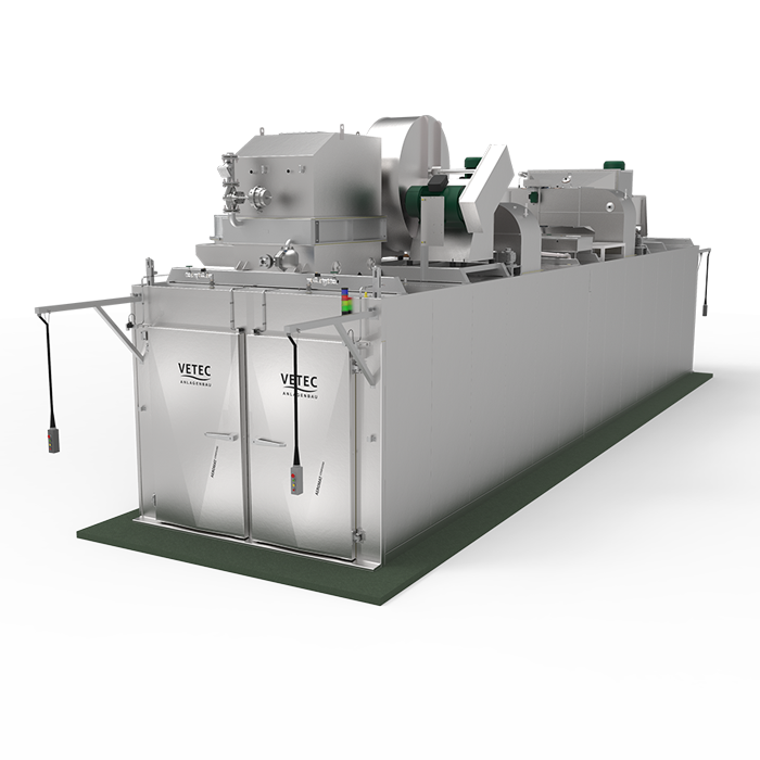 Der AEROMAT COMPOUND von VETEC ANLAGENBAU kombiniert die bekannte und bewährte Technik der Heissräucher- und Kochanlage mit der einer Intensivkühlanlage. Im ersten Schritt durchläuft Ihr Produkt folgende Prozesse: Röten, Trocknen, Warm- und Heißräuchern, Brühen, Kochen und Heißluftgaren im Heissrauch- und Kochbereich. Anschliessend erfolgt das Herunterkühlen der Lebensmittel mit Duschwasser und Luft im Intensivkühlbereich. Das halbkontinuierliche Transportsystem macht den AEROMAT COMPOUND zur flexiblen Lösung Ihrer Fleischwarenproduktion.